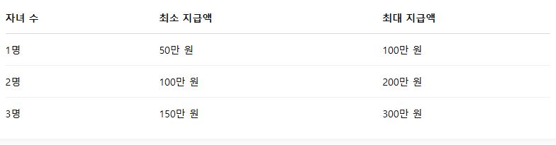 - 자녀 1인당 최대 100만 원, 최소 50만 원 지급